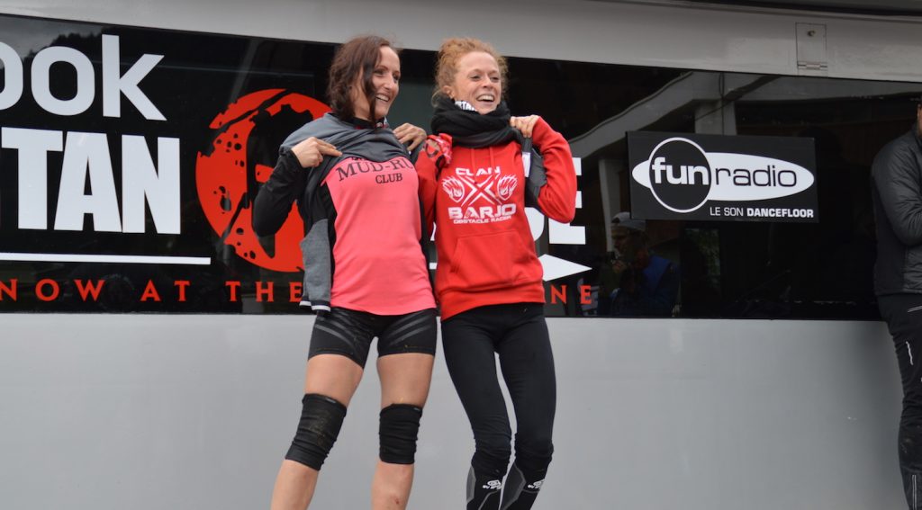 Me voici face au javelot, je pense aux conseils qu’on m’avait donnés, je visualise mon lancer et je pense positif, malheureusement cela ne suffit pas, je rate. Ce sera la première série de burpees, sur laquelle Bérangère me rejoindra. Arrivée sur le ring, j’ai les mains mouillées. J’essaie la paille et mes cheveux pour les essuyer et attrape la barre, je regarde Céline et lui dit que ça glisse trop, et je chute, direction la deuxième série de burpees. Bérangère me rejoindra encore mais je termine avant elle, je me relève et cours jusqu’au feu en poussant un cri de joie et je m’effondre dans les bras de Céline trop heureuse !