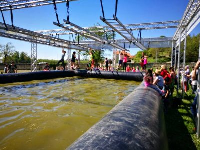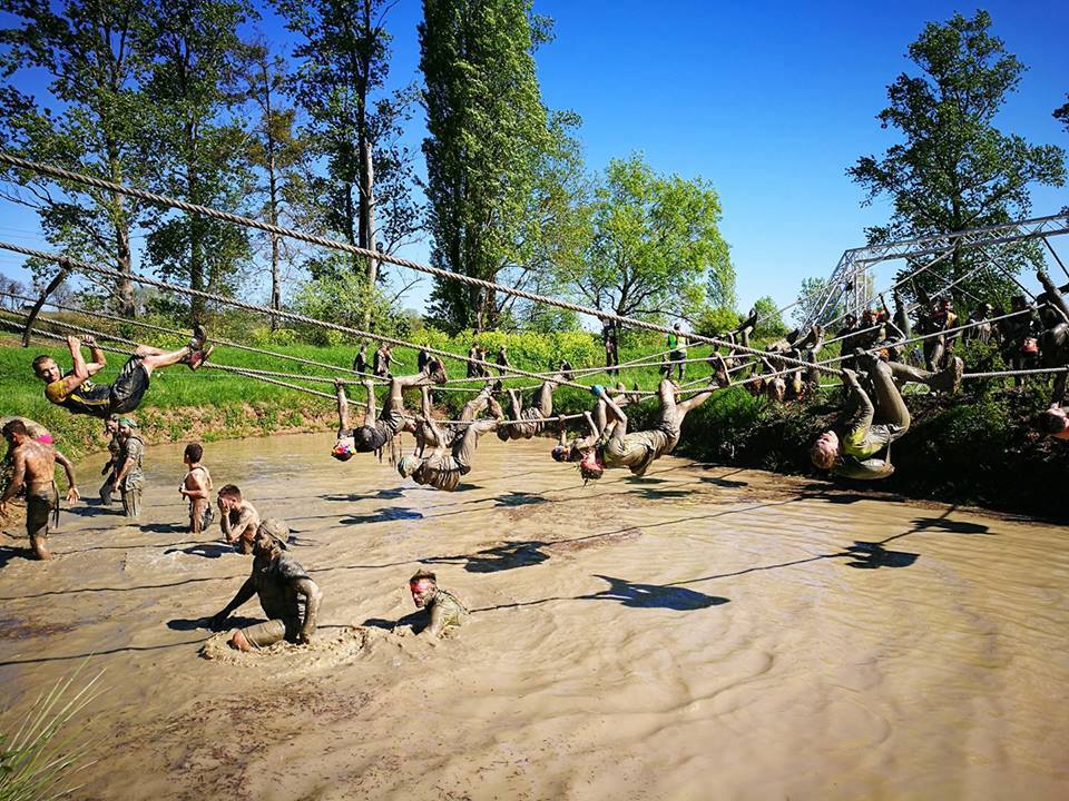Les gros boudins gonflés sont beaucoup plus durs qu’il n’y parait à passer surtout quand il n’y a pas de sangles pour s’accrocher sur le dessus. Ayant fait plusieurs frappadingues, je les franchis plus rapidement que mes camarades en m’aidant des sangles latérales (et encore c’était pas simple). Je revois encore Thomas en position de crapaud sur celle-ci et je me demandais ce qu’il faisait. Drôle ! Il partait à la pêche à la chocolatine sans doute^^ je me retrouve seul en 5ème position avec celui-ci juste devant moi. Après la Vendée et son passage dans la mélasse sur 60m, j’appréhendais la traversé du ruisseau boueux. Finalement, à quatre pattes c’est très bien passé car on s’enfonçait peu. Ainsi, j’ai même repris du temps.