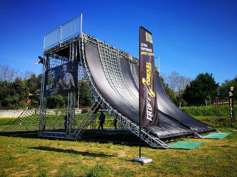 Ouch… Le nouveau « FRAPPAWALL » , rampe assez haute en toile est LE gros challenge de la course. En effet, j’ai testé une fois avant la course et les crampons des chaussures dérapent littéralement sur la toile. Julien des Limoges Mud Runner assure le live Facebook et m’encourage. Merci à lui! Je suis en direct donc je n’ai vraiment pas le droit de me craquer ^^. Je sprinte et direct mon pied dérape. Je mouline tout ce que je peux et me jette mais il me manque tellement ^^ Loin du compte…à priori tous les coureurs devant auraient échoué également. Cet obstacle est vraiment le plus dur que j’ai rencontré jusque là à égalité avec la rampe de TOUGH VIKING. Sur le second essai, je passe par la partie facile de gauche. Bouh ! Petit joueur : pénalité.