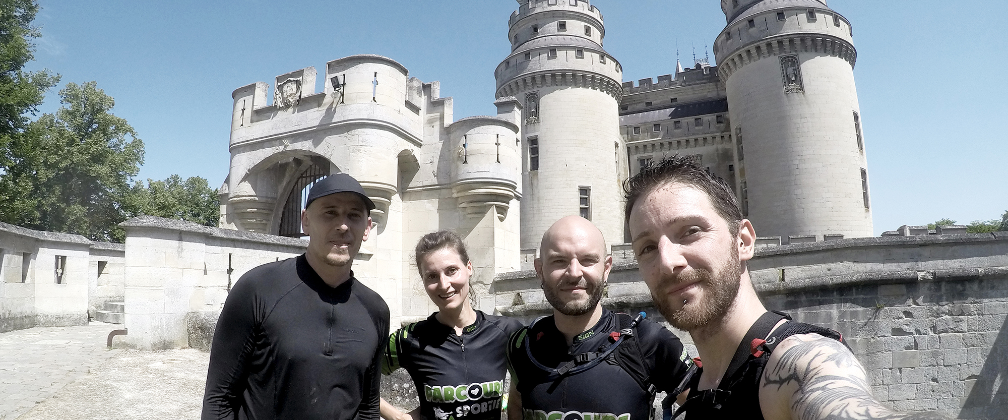 C’est d’ailleurs vers lui que l’itinéraire nous fait revenir, mais pas sans obstacles : mini-wall, équilibre, ramping, franchissements divers… et nous voici au pied du château ! Nous essayons de nous fondre avec les touristes le temps d’une petite photo, mais tout boueux que nous sommes, cela ne fonctionne pas bien longtemps 🙂
