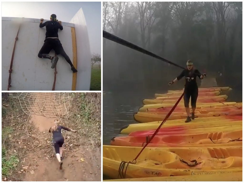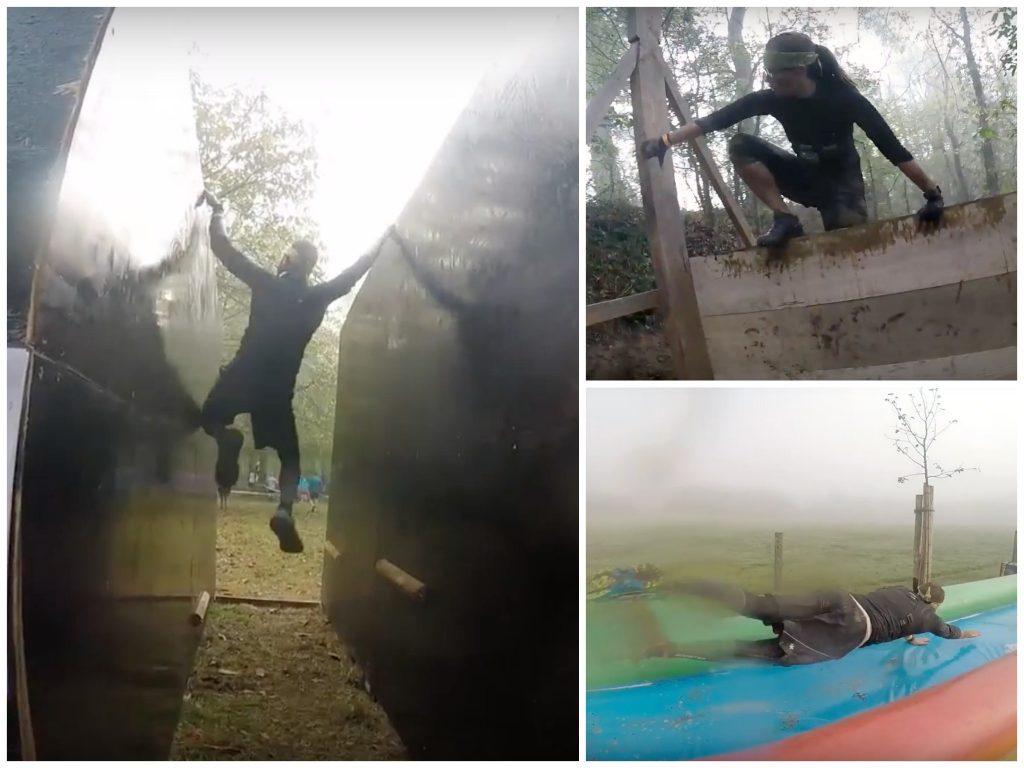 Nous reprenons la course et suivons un fil d’Ariane : mini mur incliné + toile d’araignée + passage rapide dans la forêt + mini tuyau, puis enchaînons avec un passage dans une fosse de boue sous filet, un ramping sous barbelés et un porté de sac de sable sur un parcours alternant escaliers, côtes et pentes.