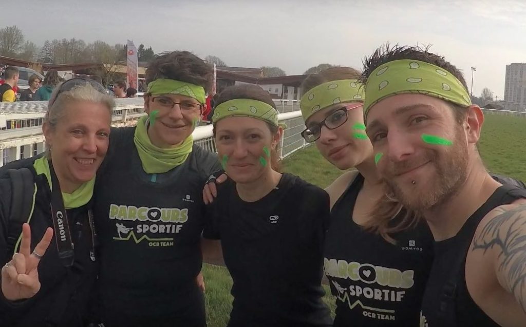 Nous croisons Carole, l’une des organisatrices, ainsi que Fabrice, le speaker, qui nous reconnaît et nous propose de faire quelques photos. Derniers préparatifs et maquillages de guerre, et nous retournons déposer nos sacs aux consignes. Nous croisons alors des coureuses qui sont venues faire la course grâce à notre vidéo de la première édition (#contents), puis nous filons vers la zone de départ où nous participons à un petit échauffement dynamique. Et c’est parti pour 5 km et 33 obstacles !
