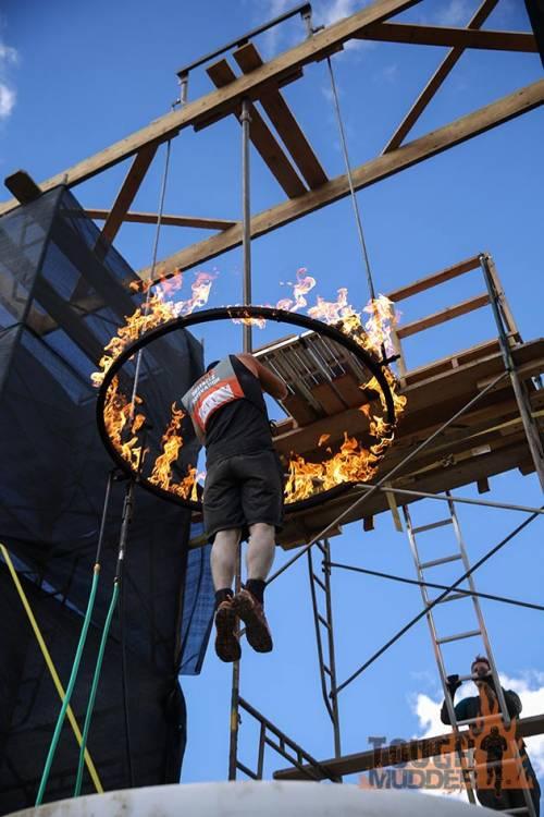 L’anneau de feu : une rampe de pompier, un cerceau enflammé et un bac d’eau à la réception composent ce flamboyant obstacle des Tough Mudder.