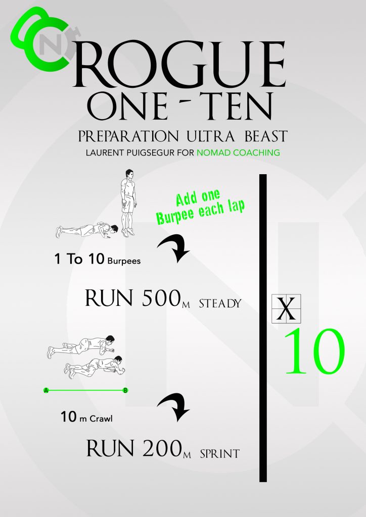 Le samedi : le WOD ROGUE 1-10, un travail de 7 km entrecoupé de travail hyper-spécifique avec des burpees pour commencer (ça fait toujours plaisir de commencer par des burpees !!!) de la course et du rampé.